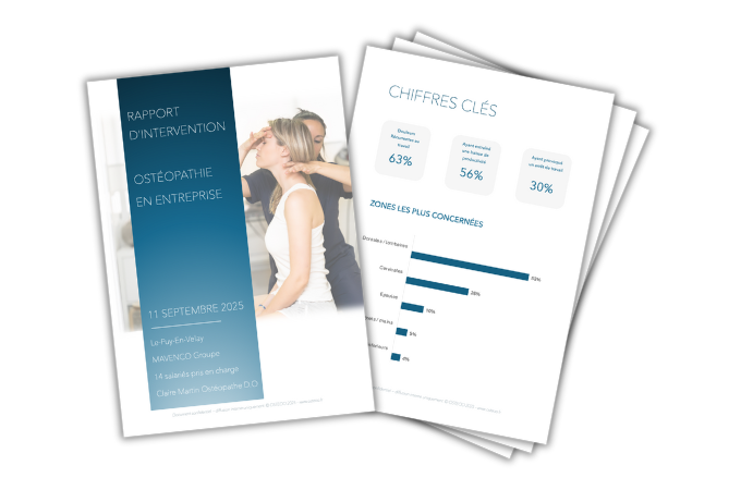 Après chaque intervention, vous recevez un rapport QVCT clair en 48H (tensions observées, recommandations pratiques...). Cadre RGPD strict, ostéopathes certifiés & assurés.